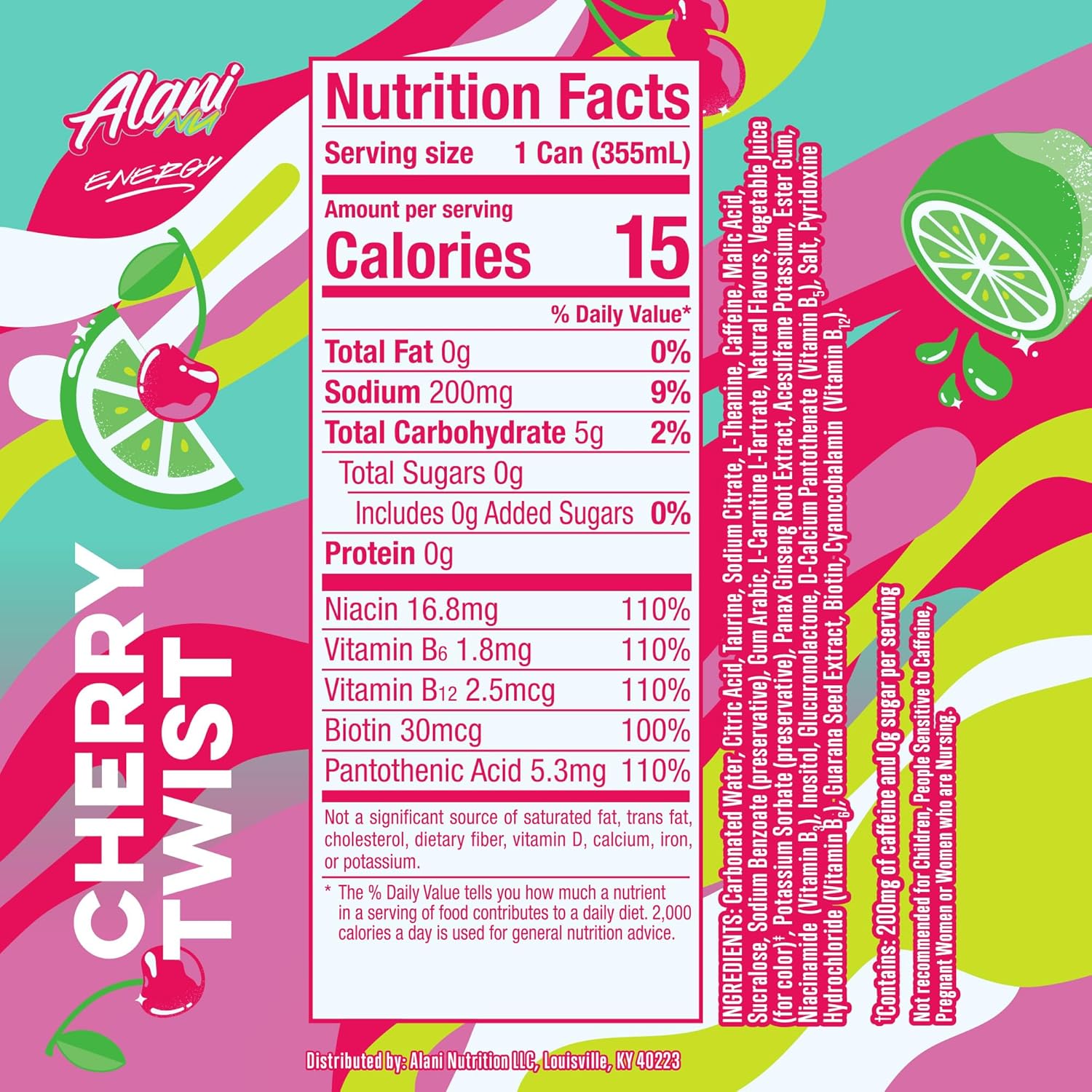 Alani Nu CHERRY TWIST Sugar Free, Low Calorie Energy Drinks, 200mg Caffeine, Biotin B Vitamins, Zero Sugar, 15 Calories, 12 Fl Oz Cans, 12 Pack