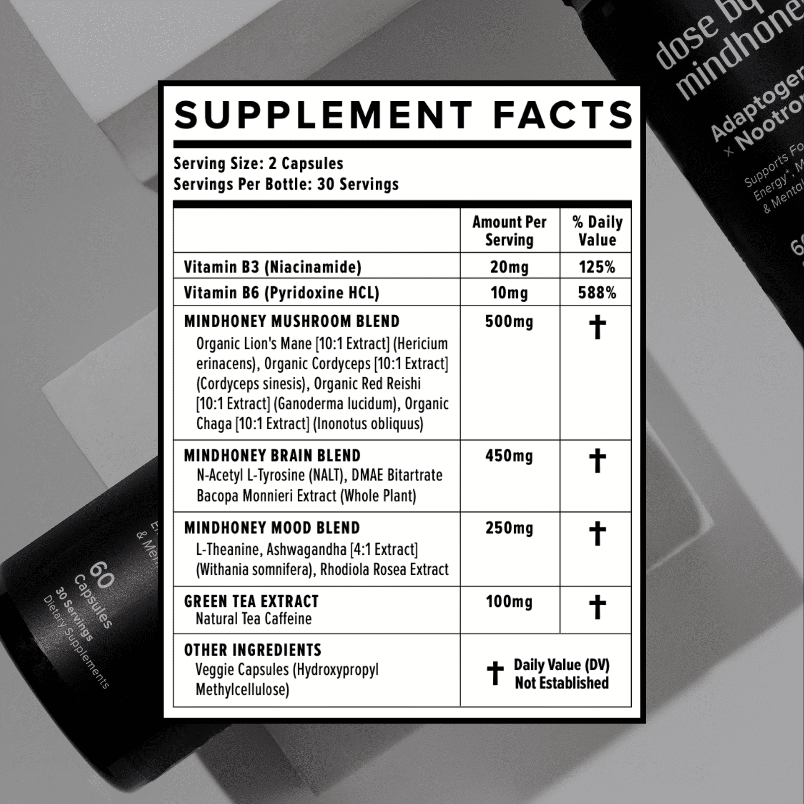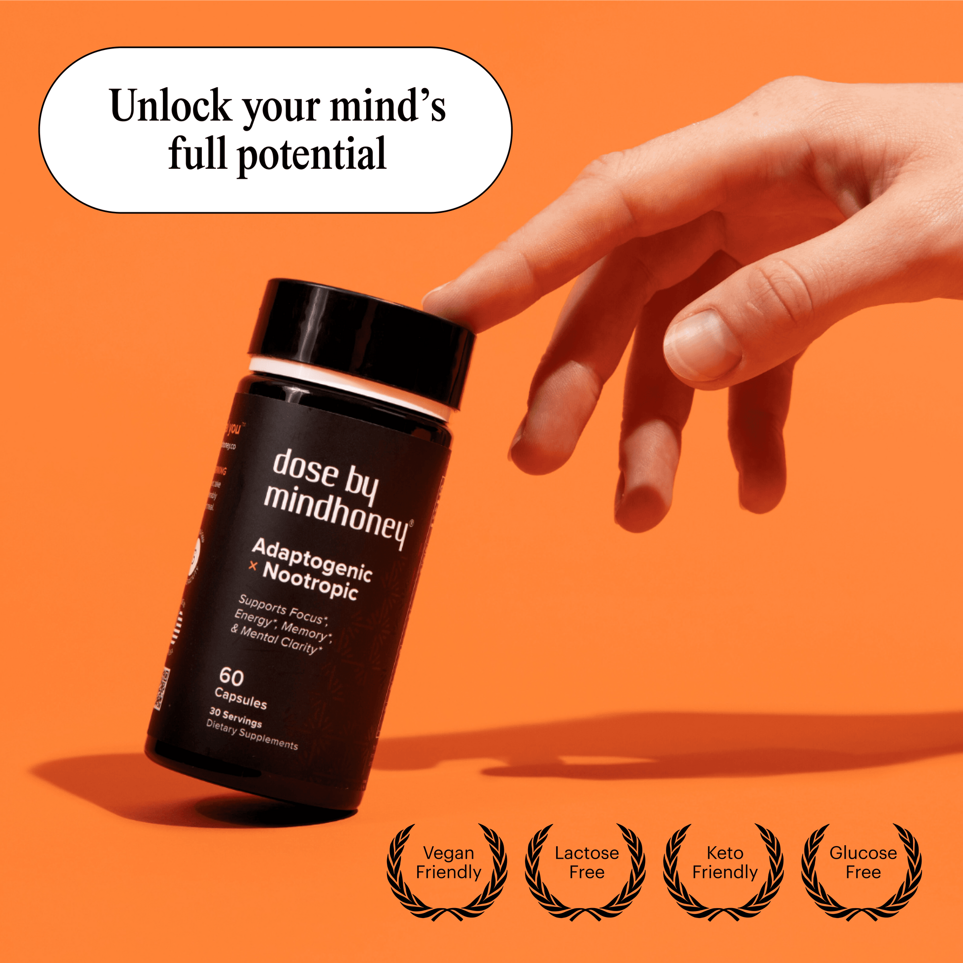 Dose by Mindhoney is an all-natural nootropic supplement designed to be an all-in-one solution for enhanced daily focus, energy, mood, and clarity support. Mindhoney's proprietary formulation is made with a unique blend of natural nootropics, adaptogenic herbs, organic functional mushrooms, and vitamins. Mindhoney's key ingredients include Ashwagandha, Lion's Mane, L-Theanine, Cordyceps, Chaga, Bacopa, Rhodiola, and more. Our mission at Mindhoney is simple - Optimize cognitive performance and celebrate the brain's creativity.