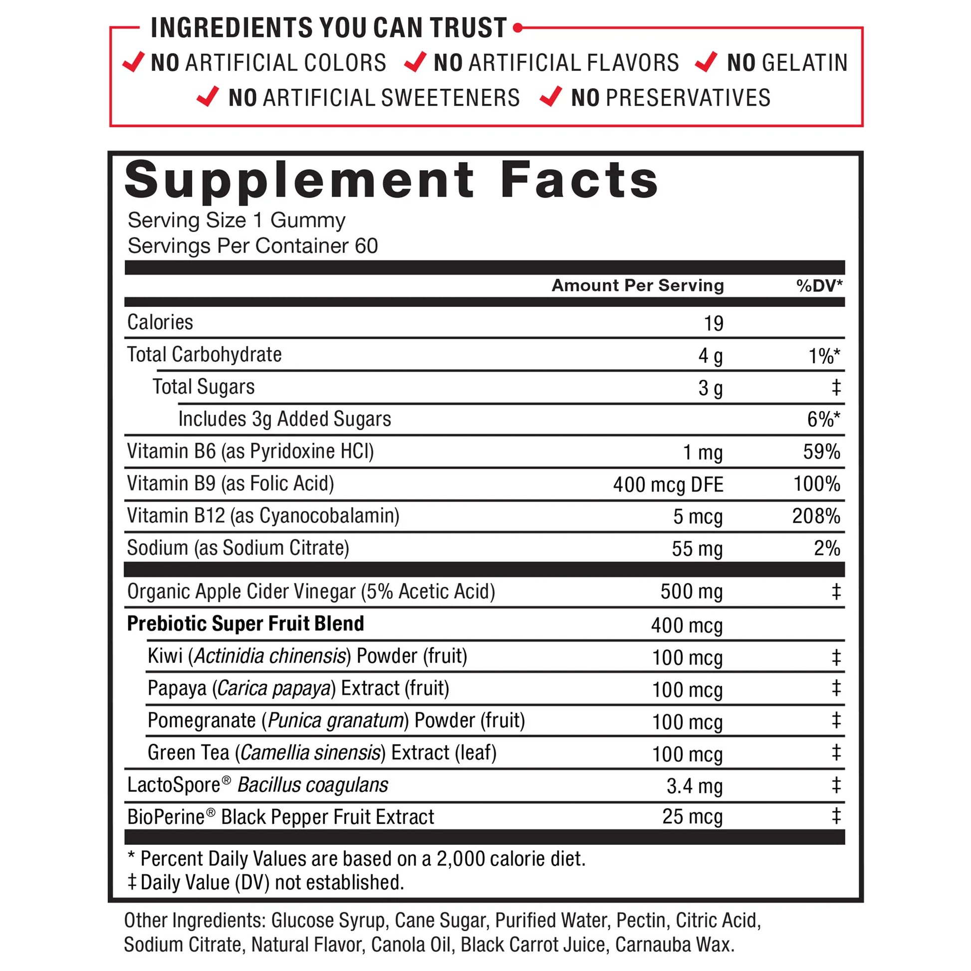 Vitamin B6 (as Pyridoxine HCl), Vitamin B9 (as Folic Acid), Vitamin B12 (as Cyanocobalamin), Sodium (as Sodium Citrate), Organic Apple Cider Vinegar (5% Acetic Acid), Kiwi (Actinidia chinensis) Powder (fruit), Papaya (Carica papaya) Extract (fruit), Pomegranate (Punica granatum) Powder (fruit), Green Tea (Camellia sinensis) Extract (leaf), LactoSpore Bacillus coagulans, BioPerine Black Pepper Fruit Extract, Glucose Syrup, Sucrose, Purified Water, Pectin, Citric Acid, Sodium Citrate, Natural Flavor, Vegetable Oil, Black Carrot Juice, Carnauba Wax