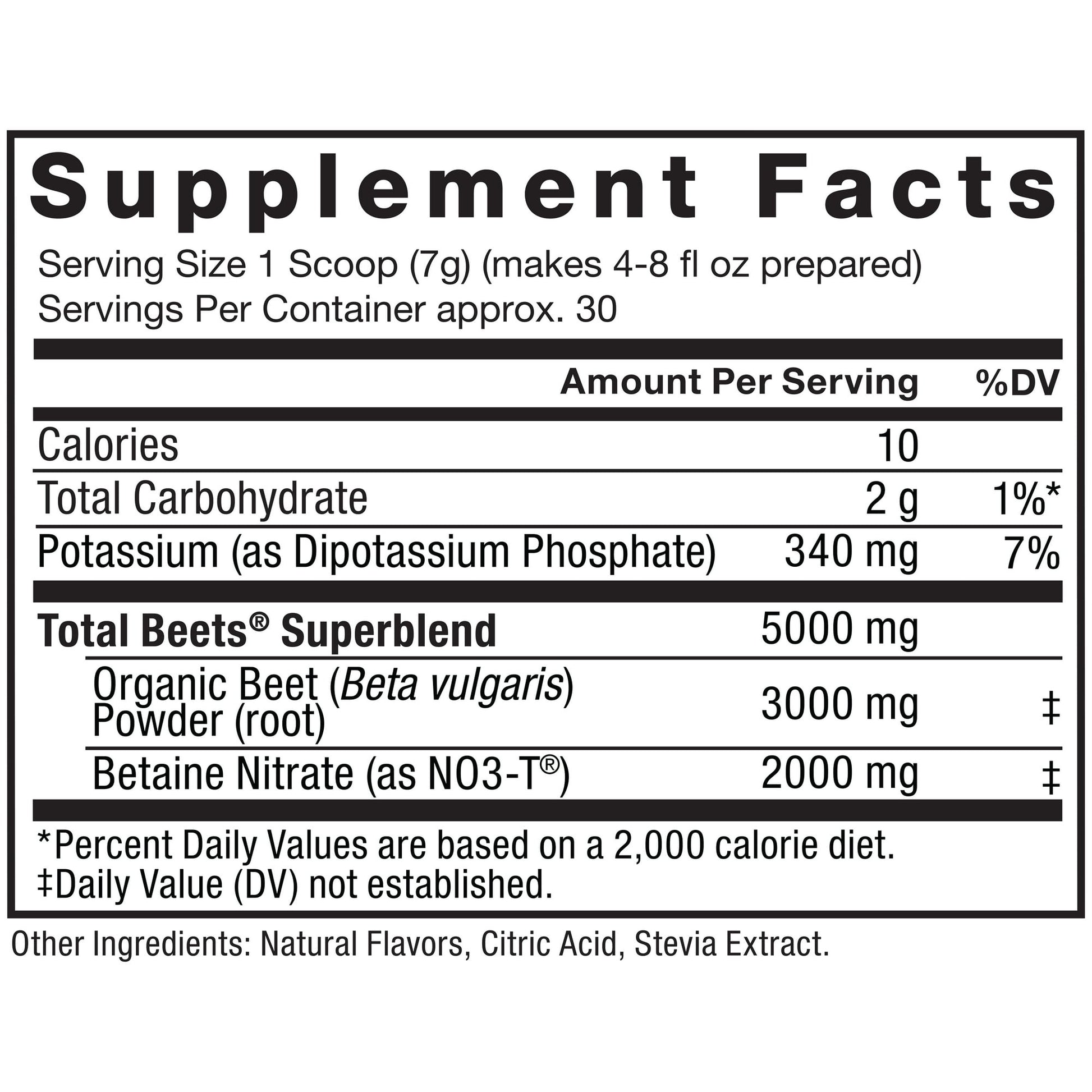 Total Beets Superblend: Organic Beet (Beta Vulgaris) Powder (Root), Betadine Nitrate (as NO3-T). Other Ingredients: Natural Flavors, Citric Acid, Stevia Extract.