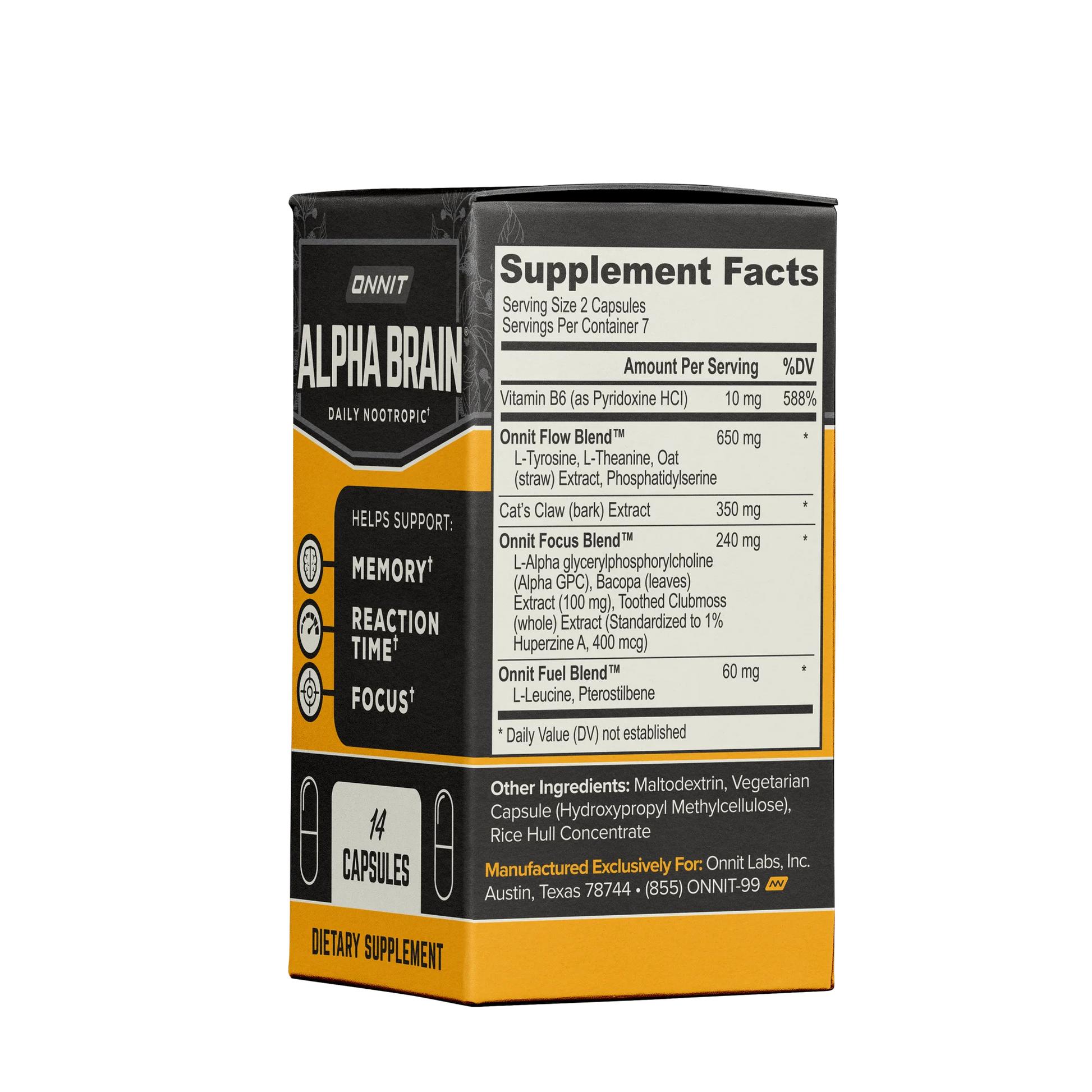 Alpha BRAIN® is a dietary supplement that helps support cognitive functions, including memory and focus. Alpha BRAIN® has been a market leader in the nootropics space since 2011 and was designed to aid productivity and flow state, the feeling of “being in the zone.” The Alpha BRAIN formula includes Vitamin B6, Huperzia Serrata Extract, and L-Theanine to help optimize mental performance.†︎ ONNIT Alpha BRAIN® capsules are sugar-free, caffeine-free, dairy-free, gluten-free, and keto diet-friendly.