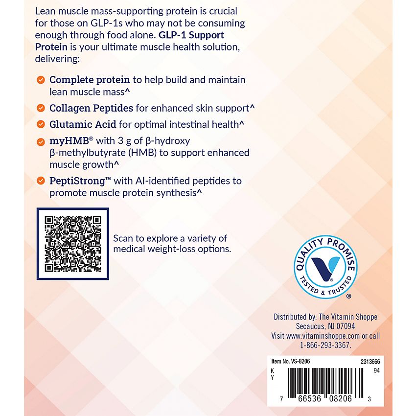 Keep the muscle—while you ditch the pounds—on your medical weight-loss journey with GLP-1 Support Protein Powder from Whole Health Rx™ by The Vitamin Shoppe®. Every serving of this naturally flavored protein shake supports lean muscle mass maintenance, skin hydration and elasticity, and digestion with 30g of protein, 5g of collagen peptides, 5g of glutamic acid, plus myHMB®, PeptiStrong®, and DigeZyme®.